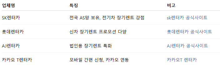 렌트카 장기대여 추천 업체는 다음과 같습니다.